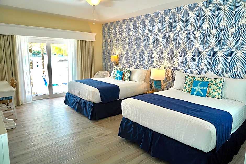 One-Bedroom Suite located on the lagoon beach with views of the Sandyport Marina Village and Canals., this air-conditioned suite has attractive, Caribbean-style décor. There is a king-size bedroom, a bathroom with a hot tub, and a seating area with a sofa bed and a 32' flat-screen cable TV. The separate living room has a fully equipped kitchen with large refrigerator, stove, oven, microwave and dishwasher. There is a 2nd 32" Flat Screen TV, lounge chair and queen-size sofa bed along with a dining table with 4 chairs and a powder room. All suites have a balcony or porch with table and chairs. Our Lagoon Beach ground floor Suites step straight onto the sand.